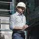 Bearded engineer in hard hat standing in factory workshop inspecting it and writing something down in clipboard