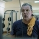 Slow motion of a mature man having hard workout on pull down machine. Getting fit in modern fitness center