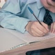 Ext CU, Tracking: Schoolboy does homework, writes pen in notebook, on the table is tablet.