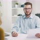 Boss man reading job resume. Refusing employee candidate, sad woman in interview office