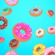 Looped colorful donuts falling down with confetti effect on a turquoise blue background.