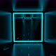 Very fast rotating flying through cyan cube tunnel and glowing neon squares. 3D camera moving fast and blue particles fly towards, seamless loop animation.