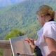 Young painter, woman working on picture of mountain landscape on canvas using paintbrush, paints and palette. Standing at terrace with breathtaking view. Close up, slow motion