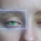 Female eye with program code. Futuristic. Technology. Blue. Eye close-up with computer data appearing