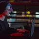 Lockdown of young woman-hipster sitting at café table at laptop and typing on keyboard