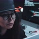 Close up of young female programmer in cap and glasses coding on computer in dark office