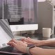 Slowmo closeup of unrecognizable female programmer typing program code on laptop connected to pc computer, sitting at desk in home office