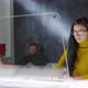Lockdown of young Middle Eastern woman in casual wear sitting at café table at invisible multi-touch monitor of futuristic PC and typing on wireless keyboard. Video suitable for adding AR graphics