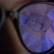 Female scientist in the glasses looking the presentation of the new microchip. Reflection of the video image in the glass of the glasses. Innovation neural cpu processor in the hand of engineer.