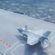 F-35 fighter takes off vertically from the aircraft carrier in clear day.