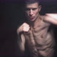 Muscular young man shows the different movements and strikes in the studio on a dark background