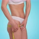Figure check up. Unrecognizable caucasian fit lady in underwear measuring her hips with measuring tape, blue studio background, slow motion