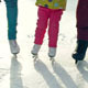 Tilt up of little child skating awkwardly supported by unrecognizable parents