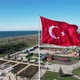 Close-up view of Turkish flag waving on the coast, drone shot of Turkish flag against seascape, Turkey’s independence symbol combined with landscape