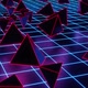 Floating reflective red pyramids over a grid plane on a seamless loop.
