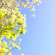 Maple flower trembles in the wind against the background of a defocused young foliage and blue sky under the rays of the bright spring sun