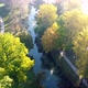 Flying over view trees with yellow and green leaves, lake, meadow, dirt paths, landscape design in nature park in autumn early sunny morning. Wonderful beautiful natural background. Aerial drone view
