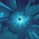futuristic blue hologram. 4k seamless looped animation. Fly through mirror tunnel with neon pattern, glow lines form sci fi pattern. Bright reflection neon light. Simple bright bg, sci fi structure