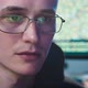 A young hacker looks at the monitor intently. He wears glasses. Behind him on the screens are constantly moving lines of program code that the programmer writes