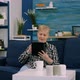 Focused senior grandmother relaxing sitting on sofa typing tablet browsing, searching informations, shopping online, while adult man working at laptop in background. Person using notepad gadget