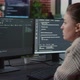 Focused software developer writing code looking at multiple computer screens displaying machine learning algorithm. Programer coding user interface while colleagues doing teamwork in background.