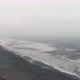 Aerial footage of white ocean waves on a wet shore into the fog near Sharp Point at Dry Lagoon State Park, California, USA