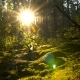 Gimbal shot of fairy moss in a deciduous forest . Sun skipping through the trees on sunset.