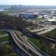 Aerial view of a freeway intersection and football stadium Spartak Moscow Otkritie Arena