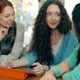 Three girls using one device and discussing something
