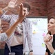 Friendly working environment. Cheerful team leader, boss startup ceo giving high five to multiracial group of employees, corporate meeting, good and productive office meeting with coworkers.