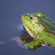 Close-up telephoto shot of a male green frog (edible frog, common water frog, Pelophylax kl. esculentus) blowing its cheek pouches before swimming away.