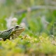 frog sitting in the grass, toad on the green grass, slippery cold frog in nature, warts on the skin.