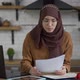 Front view of thoughtful focused woman in hijab and eyeglasses examining documents analyzing project strategy. Portrait of concentrated Middle Eastern professional working in kitchen in home office