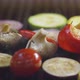 Closeup tracking shot of cooking tomato, champignon, onion, eggplant, zucchini and chili pepper on grill.