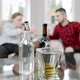 Full and empty alcohol bottles on glass table with two blurred men clinking and toasting at background. Young Caucasian male friends resting on weekends indoors at home