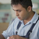 Focus on worker packing merchandise in box and smiling at the joke of his colleague talking to woman in the background, tilt