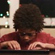 Black kid at keyboard. Boy at computer table. Future programmer. Indigo child.