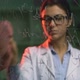 Close-up of girl behind the glass wall writing formula on it and then wiping it off