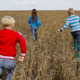 Camera following group of kids running in the wheat playing tag game