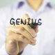 Young Man, Businessman, entrepreneur, creative designer, freelancer writes and draws on transparent wall : Genius