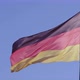 a German flag is waving in the wind, the sky is blue.
