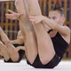 Group of young active teenage girls sitting on floor in school gym and performing scissors exercise