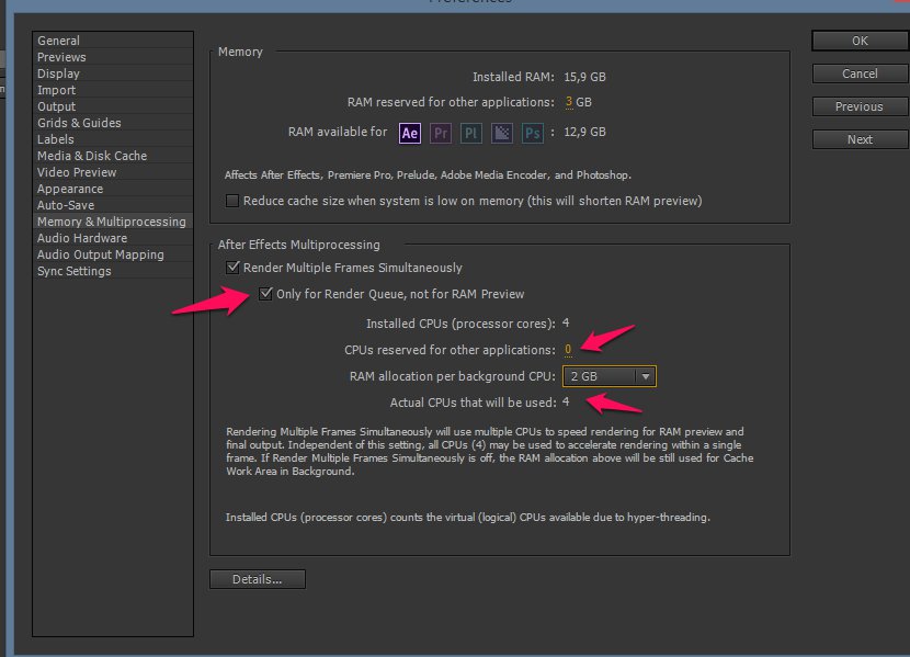 The project is technically complex, so the render time will be more than in “quick slideshow”. To reduce rendering time you can enable Render Multiple Frames Simultaneously. The more you have the CPU, the faster rendering and the type of video card does not matter here. You can see this lesson from Todd Kopriva for more understanding – Using ‘Render Multiple Frames Simultaneously’ Multiprocessing