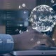 Animation of globe, data and connection network spinning while a young Caucasian man is using a laptop computer in the background