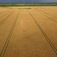 Gold wheat field in summer. Ripe grain ear plants. Rural natural landscape at countryside. Aerial view from drone