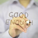 Man, Businessman, entrepreneur, stock trader, analyst or banker writes on transparent wall : Good Enough
