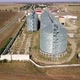 Grain elevator. Metal grain elevator in agricultural zone. Agriculture storage for harvest. Grain elevators on green nature background. Exterior of agricultural factory