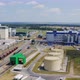 Modern agro-processing plant. Granary elevators. Silver silos on manufacturing for processing drying cleaning and storage of agricultural products.