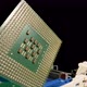 Green computer CPU microprocessor or processor on a black background. Close up of metallic gold pins of computer processor. Computer motherboard with processor, capacitors, chips, slots for RAM and memory, induction coils.
