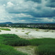 This is a bundle of 2 aerial drone footage flying above a green vegetation where was once a lake during an overcast weather with heavy clouds in the summer.
